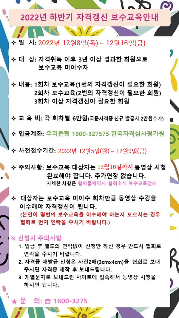 ¡Ø 2022³â ÇϹݱâ Àڰݰ»½Å º¸¼ö±³À°¾È³»(12¿ù8ÀÏ~12¿ù16ÀÏ)