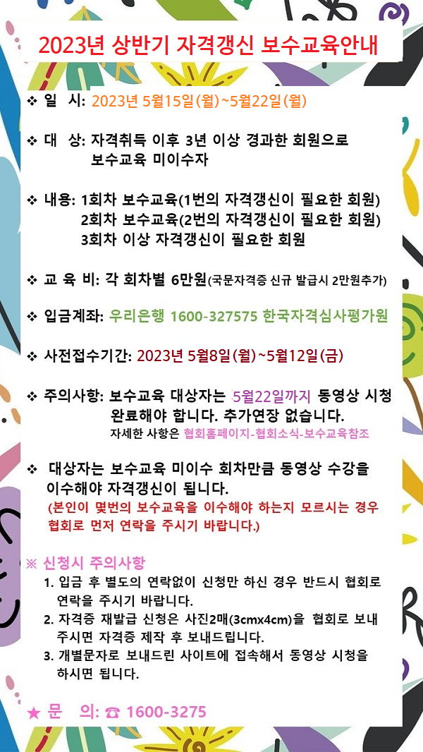 ¡Ø 2023³â »ó¹Ý±â Àڰݰ»½Å º¸¼ö±³À°¾È³»(5¿ù15ÀÏ~5¿ù22ÀÏ)